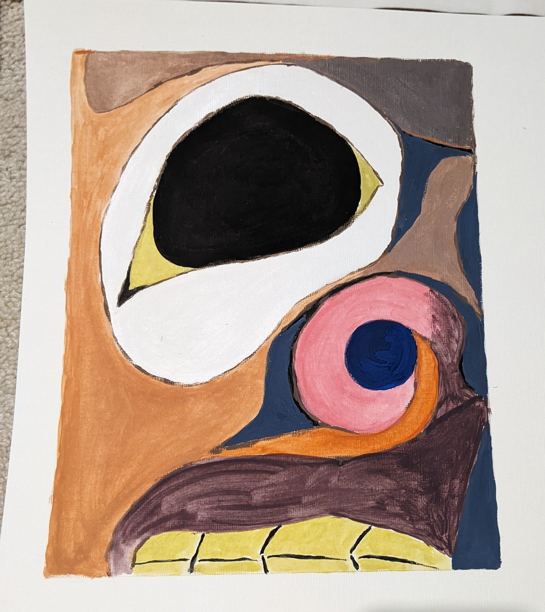 The inspiration for my largest acrylic piece came from the awakening of nature in spring, first tempting me with the warmth of yellow. I explored the full gradation of analogous hues—from green and yellow-green through yellow, yellow-orange, and orange—capturing every value and saturation of yellow across the canvas. By varying the proportions of flower shapes, I created points of emphasis, with the palest daffodil in the foreground symbolizing nostalgia and alienation, much like Vincent van Gogh’s Irises, where a lone white iris among blue ones suggests loneliness.